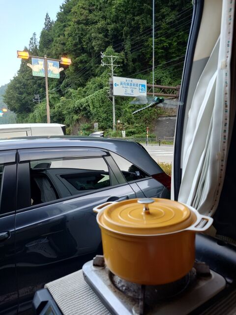 明け方、寒いテントから車内へ移動。FFヒーターを運転しますよ。電子レンジ稼働中。テ・・・
