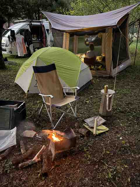 テントに薪ストーブをビルトインします。静かでいいキャンプ場ですよ。お日様が沈んで・・・